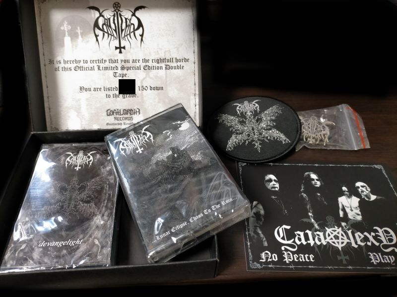 マレーシアのGoatlordth Recordsより限定150個でテープボックスがリリース!1st「...Lunar Eclipse, Chaos to the Ruin...」、2nd「devangelight」のテープを2本、メタルピンバッヂ、布パッチ、ポストカード入り!!!